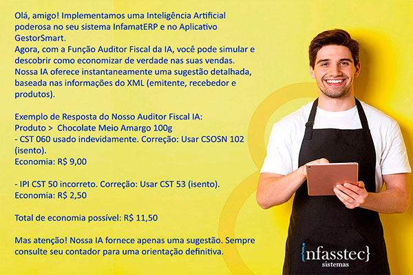 -Infamat® ERP: O coração da sua operação. Nosso software centraliza a gestão de notas fiscais (NF-e, NFC-e, etc.), vendas, estoque e finanças em um só lugar.