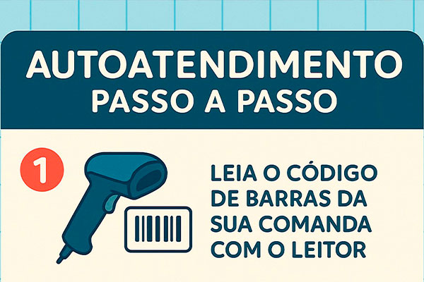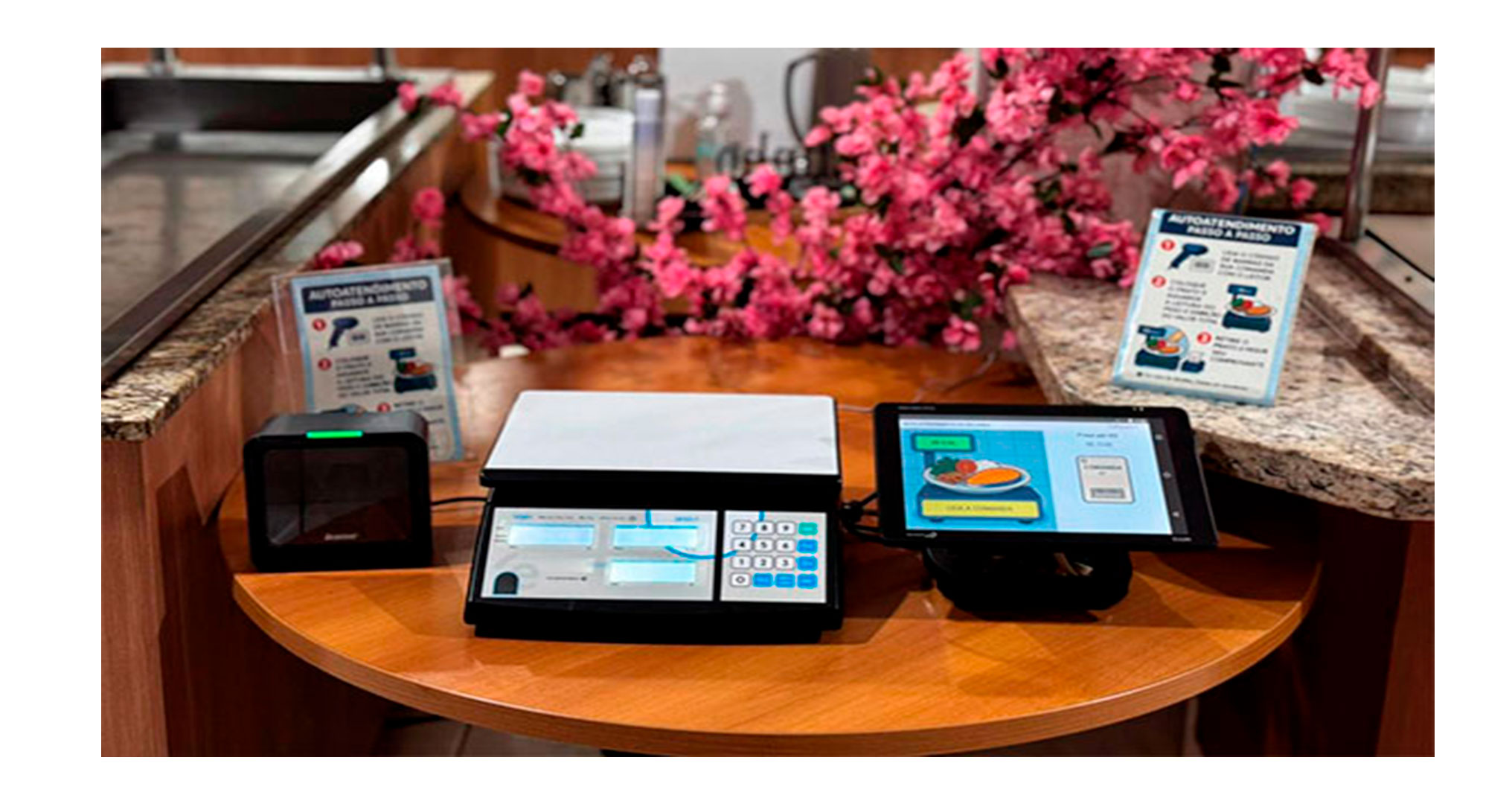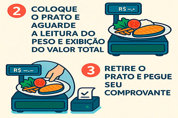 Leia o código de barras da comanda consumo, coloque o prato na balança e aguarde a leitura do peso e a exibição do valor total. Em seguida, retire o prato.