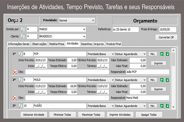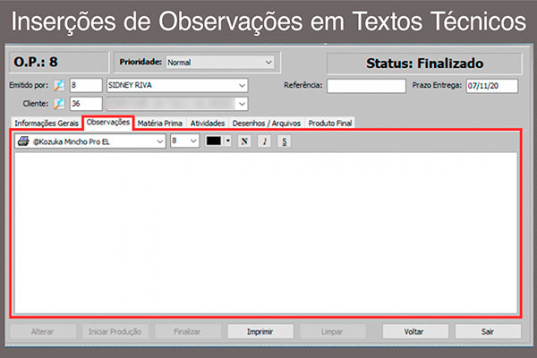 Controle de Perdas, Apontamento de Horas Homens e Máquinas, Controle de Almoxarifado, Ordem de Produção, Vários modelos de Impressão, Senhas e níveis de acesso, Controle de Qualidade, Etiquetas de Processos.